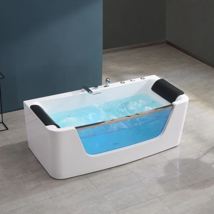 Chiếc bồn tắm massage đặt sàn này là sự kết hợp hài hòa giữa chất liệu “Acrylic Lucite cao cấp” và “mặt kính trong suốt”, tạo hiệu ứng thị giác ấn tượng và tăng chiều sâu không gian. Thiết kế đôi ngả đầu êm ái, tích hợp hệ thống massage thủy lực kết hợp bóng khí, Mowoen MW8308BHB mang đến trải nghiệm thư giãn đỉnh cao như spa tại gia, mỗi ngày.