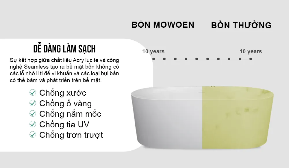 Sự kết hợp chất liệu Acrylic Lucite, lớp phủ nano bên ngoài cùng công nghệ liên mạch Seamless, tạo nên bồn tắm Mowoen hoàn hảo, khả năng chống lại các yếu tố gây hại, an toàn cho người dùng, duy trì vẻ đẹp với thời gian.