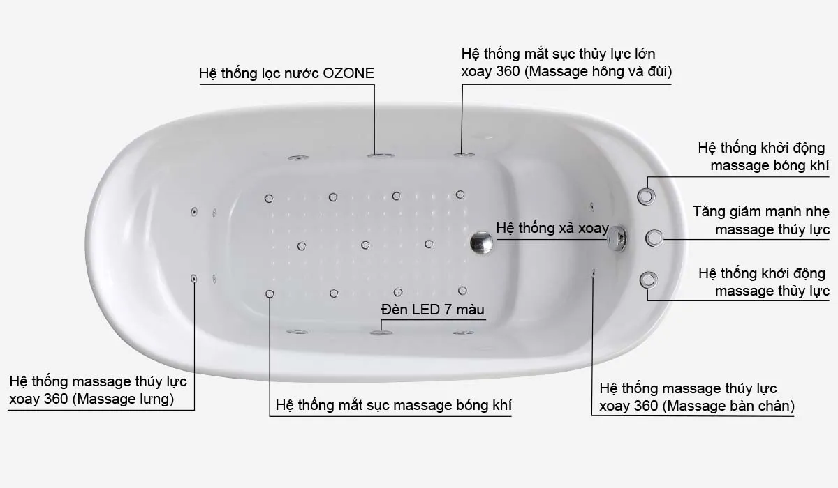 Cung cấp ánh sáng 07 màu để thiết lập màu nước. Ánh sáng cùng với màu sắc tạo nên liệu pháp sắc ký chữa lành cơ thể, tâm trí của con người.