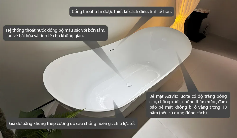 Thiết kế dáng thuyền thanh thoát kết hợp cùng chất liệu Acrylic Lucite trắng tinh khôi, cạnh mỏng tinh tế giúp không gian thêm rộng mở và cuốn hút. Ứng dụng Công Thái Học thông minh giúp ôm sát cơ thể, nâng đỡ từng đường cong tự nhiên, mang lại sự thư giãn sâu cho cả cơ thể lẫn tâm trí. Đặc biệt, công nghệ Seamless Technology – đúc liền khối không đường nối – không chỉ tăng độ bền mà còn tôn lên vẻ mượt mà, tinh xảo đến từng chi tiết.