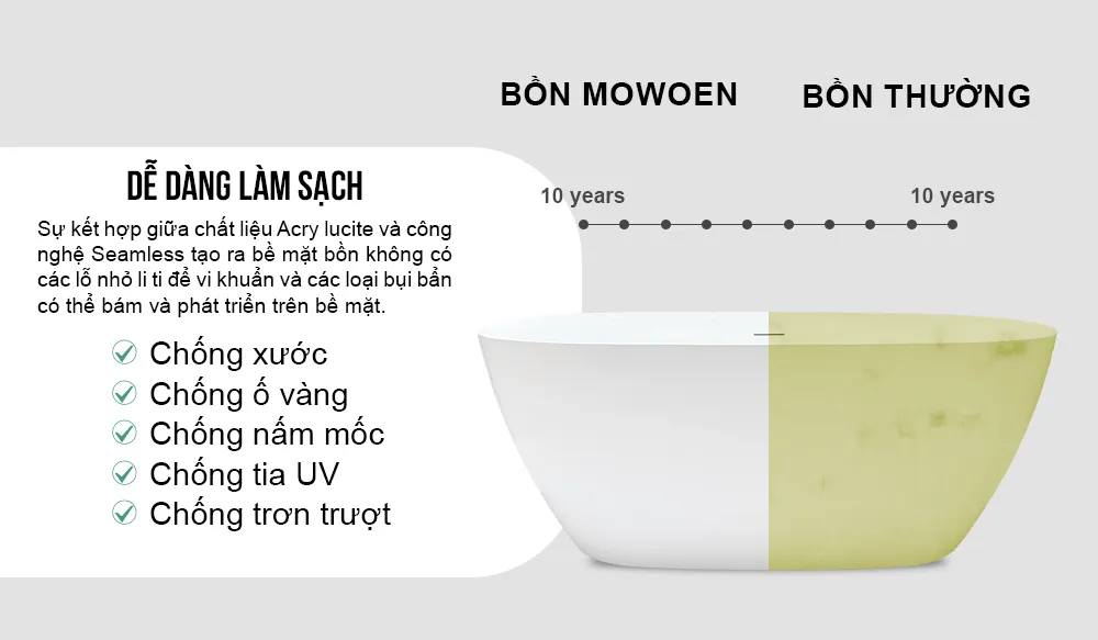 Sự kết hợp chất liệu Acrylic Lucite và lớp phủ Nano bên ngoài cùng công nghệ liên mạch Seamless, tạo nên bồn tắm Mowoen hoàn hảo có khả năng chống lại các yếu tố gây hại, an toàn cho người dùng và duy trì vẻ đẹp với thời gian.
