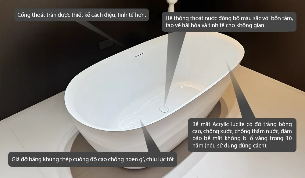 Hệ thống chống tràn được tích hợp ngay trên thành của bồn tắm. Nguyên lý hoạt động như một van an toàn, khi mức nước vượt quá mức cho phép, hệ thống thoát tràn sẽ hoạt động, ngăn chặn nước tràn ra sàn phòng tắm.