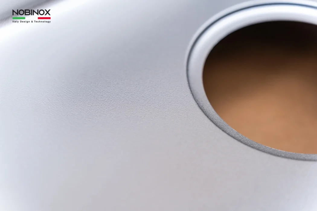 Bề mặt trống được xử lý bằng công nghệ Núi lửa với họa tiết vân đá tinh tế, mang lại cảm giác mạnh mẽ, hiện đại và cao cấp. Lớp bề mặt này giúp hạn chế tối đa thiết bị bong do va chạm trong quá trình rửa, đồng thời giảm bám vân tay, dầu mỡ và trượt nước. Việc bảo vệ sinh phải trở nên nhanh chóng, dễ dàng hơn, giúp chậu luôn giữ được tính thẩm mỹ như mới.