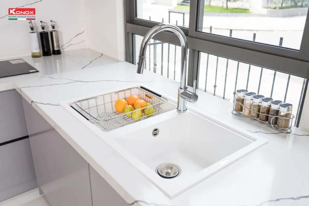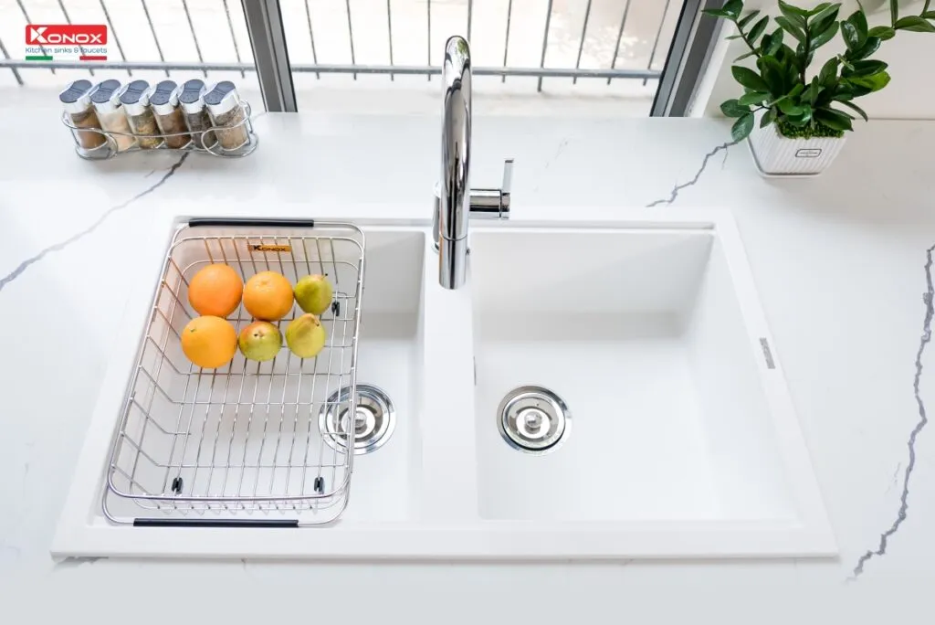 Chậu rửa bát Granite Sink Phoenix Smart 860 – White Silver nằm trong bộ sưu tập chậu vòi đá cao cấp của Konox – Kiệt tác Ý trong lòng bếp Việt