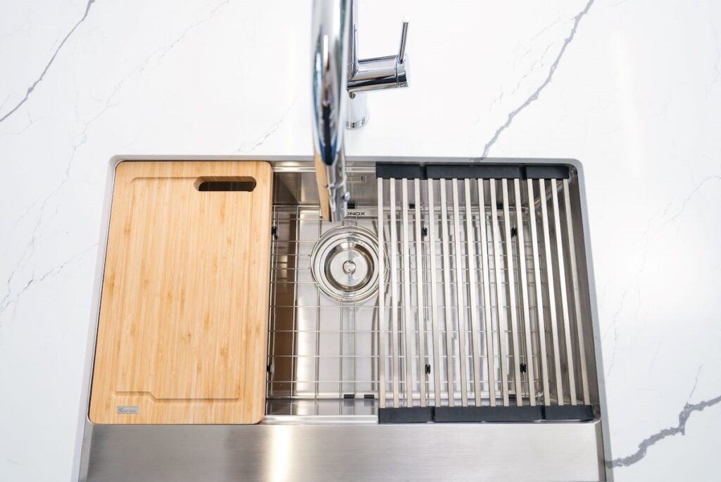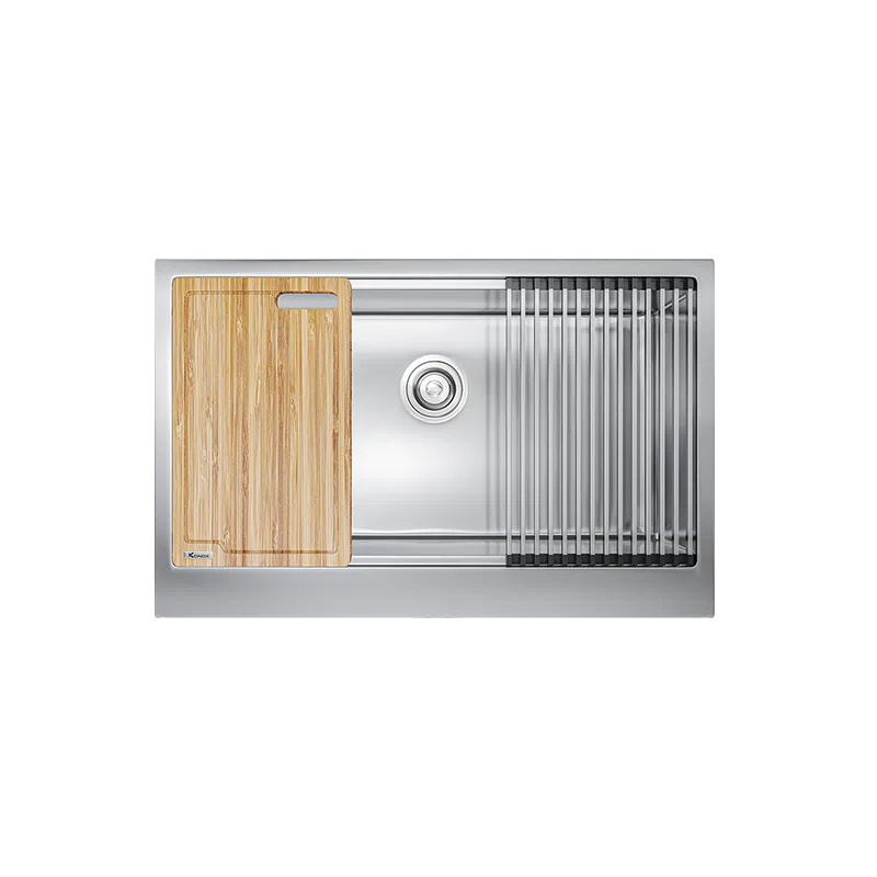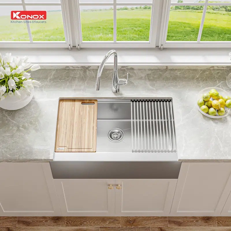 Workstation – Apron Sinks (hay còn gọi Farmhouse sinks) – dòng sản phẩm được Konox lấy cảm hứng, phát triển từ căn bếp nông trại nơi miền quê yên bình của Pháp, Ý, Anh,…- gian bếp là trái tim của ngôi nhà phong cách đồng quê.