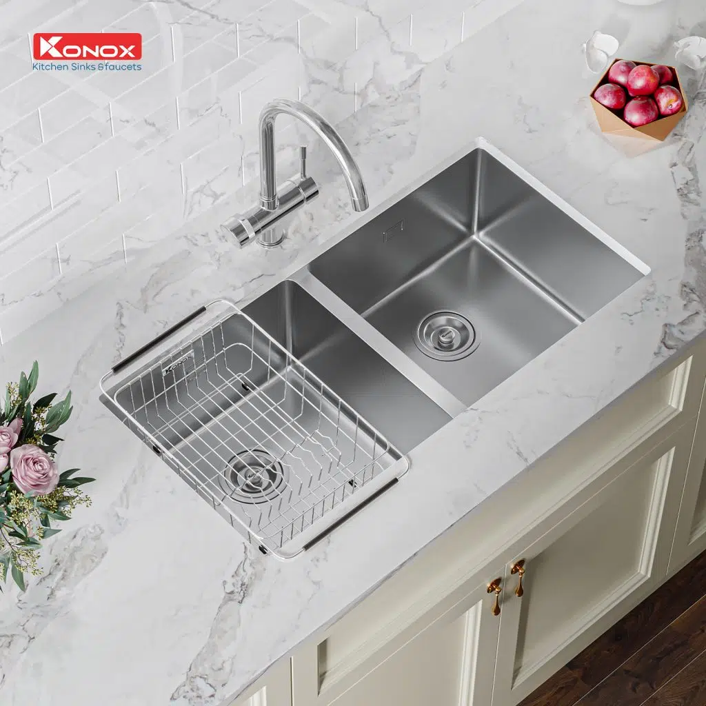 Người dùng linh hoạt trong việc lựa chọn hố chậu theo nhu cầu sử dụng, giúp tiết kiệm nước với thiết kế 2 hố chậu cân.
