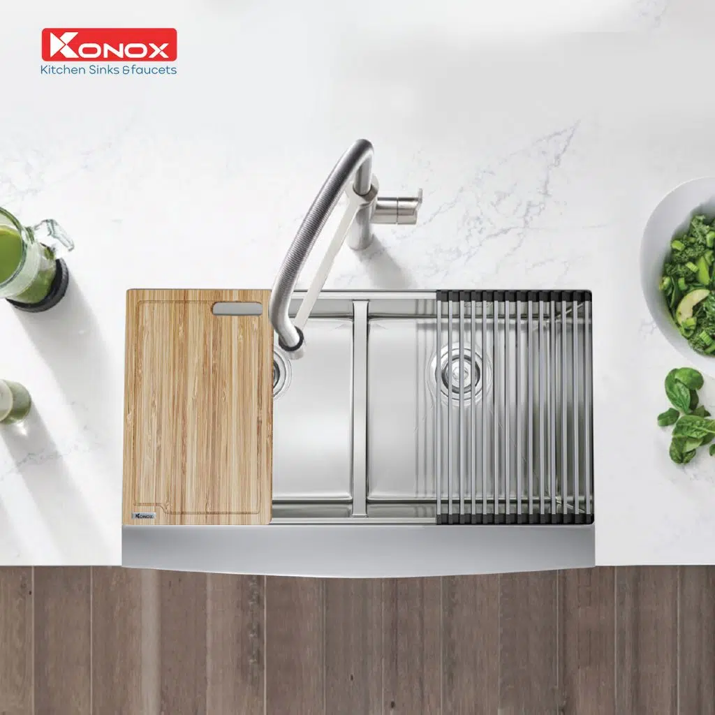 Workstation – Apron Sinks (hay còn gọi Farmhouse Sinks) – dòng sản phẩm được Konox lấy cảm hứng, phát triển từ căn bếp nông trại nơi miền quê yên bình của Pháp, Ý, Anh,…- gian bếp là trái tim của ngôi nhà phong cách đồng quê.