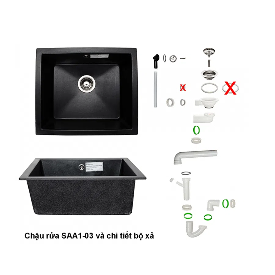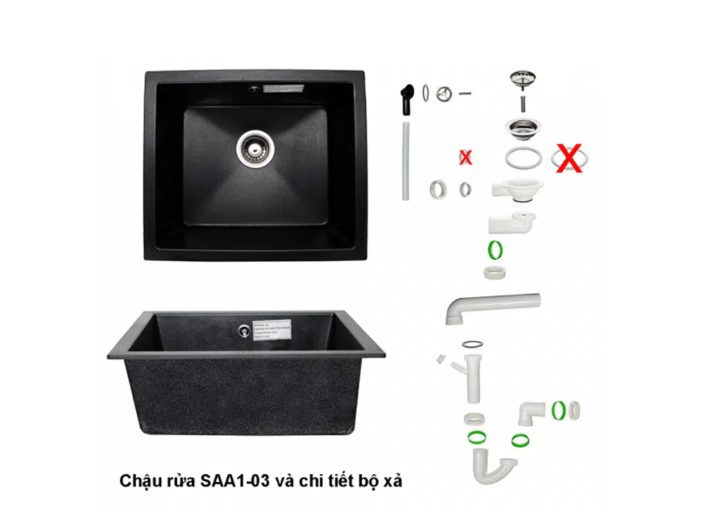 Chậu rửa chén bằng đá Granite SAA1 của Carysil đã bao gồm đầy đủ bộ xả (xiphong) phía dưới. Khách hàng sẽ không phải lo lắng mua thêm bộ xả khi mua mới chậu.