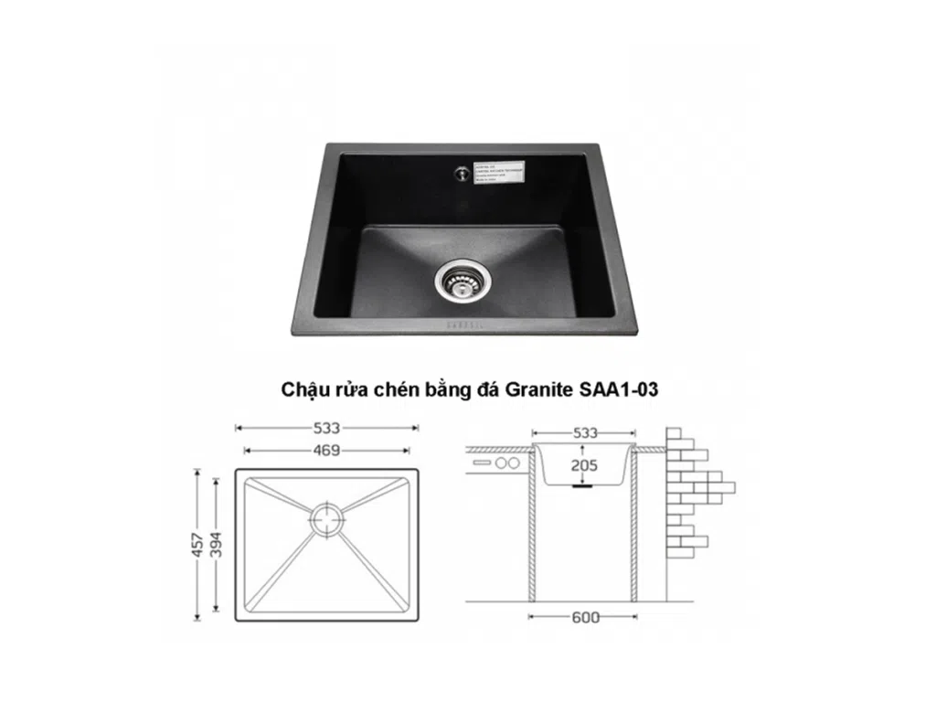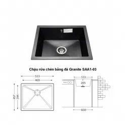 Hình ảnh kỹ thuật chi tiết của sản phẩm chậu đá granite 1 hố nhỏ SAA1