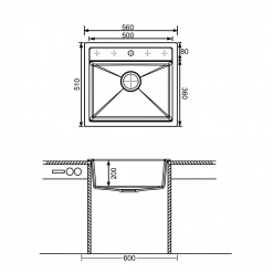 Hình ảnh kỹ thuật chi tiết của sản phẩm chậu đá granite 1 hố nhỏ WAL3
