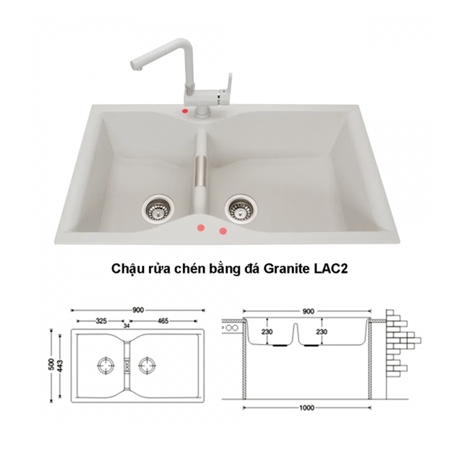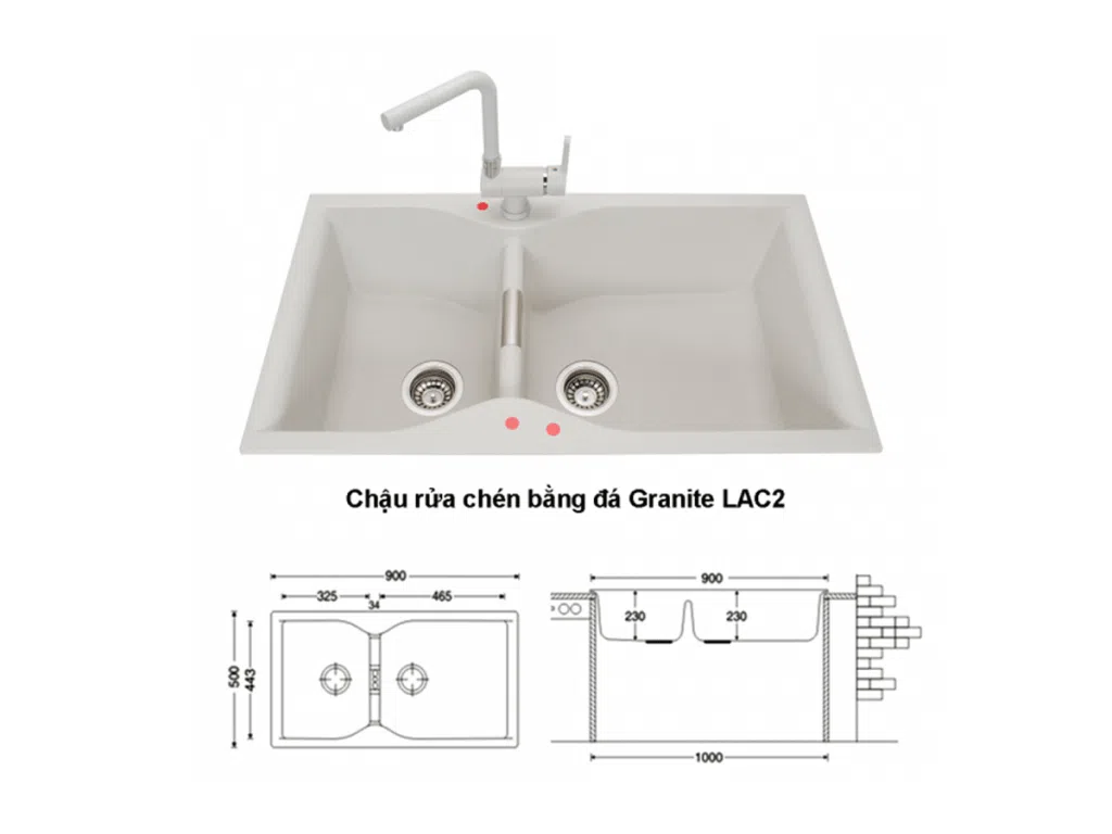 Kích thước chậu rửa chén bằng đá grantie 2 hố 900mm LAC2