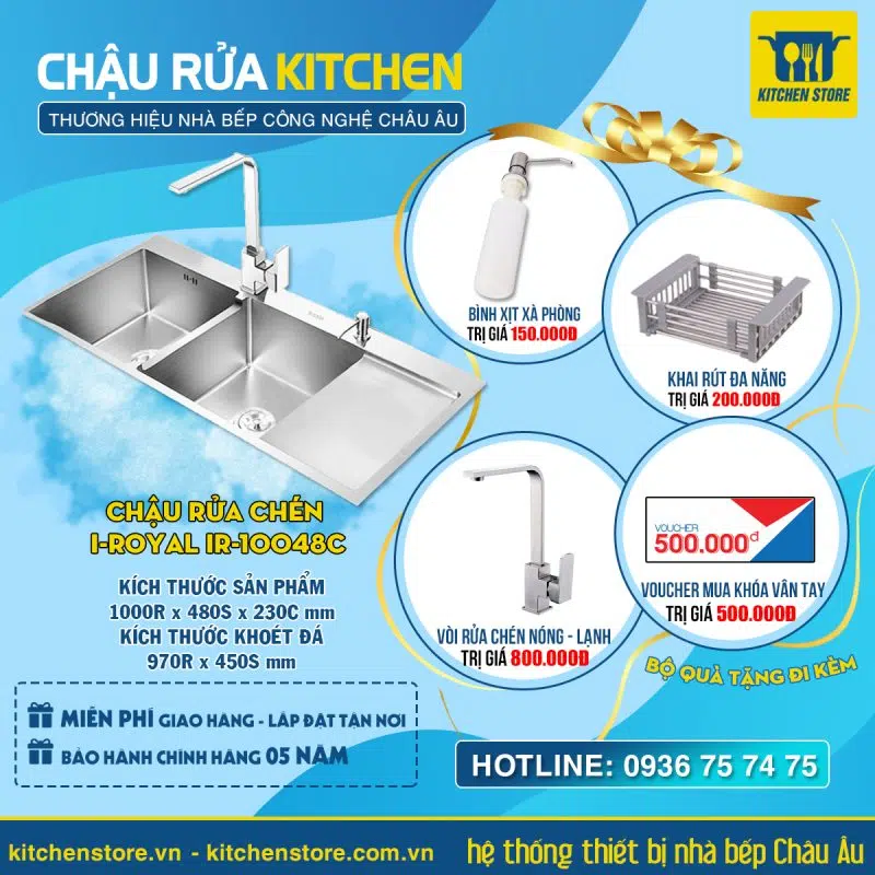 Chậu rửa chén inox 304 I-Royal IR-10048C đúc nguyên khối có kiểu dáng sang trọng, thiết kế mượt mà, chi tiết tinh xảo kết hợp với chất liệu Inox 304 giúp bề mặt sáng bóng và tuổi thọ chậu từ 10 – 15 năm.