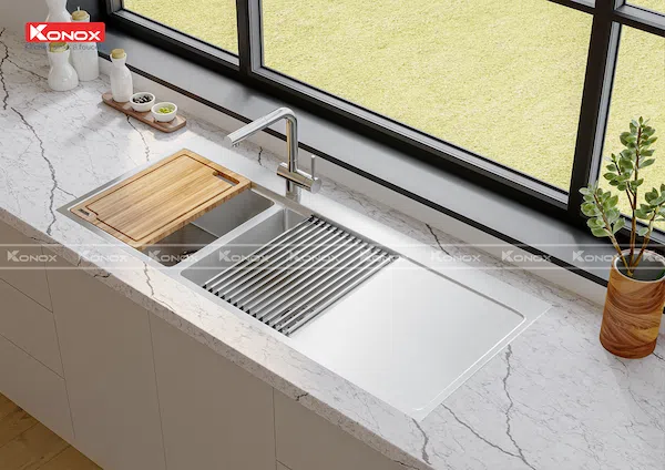 - Dòng chậu hạ bậc – tích hợp công năng: thớt gỗ, rollmat