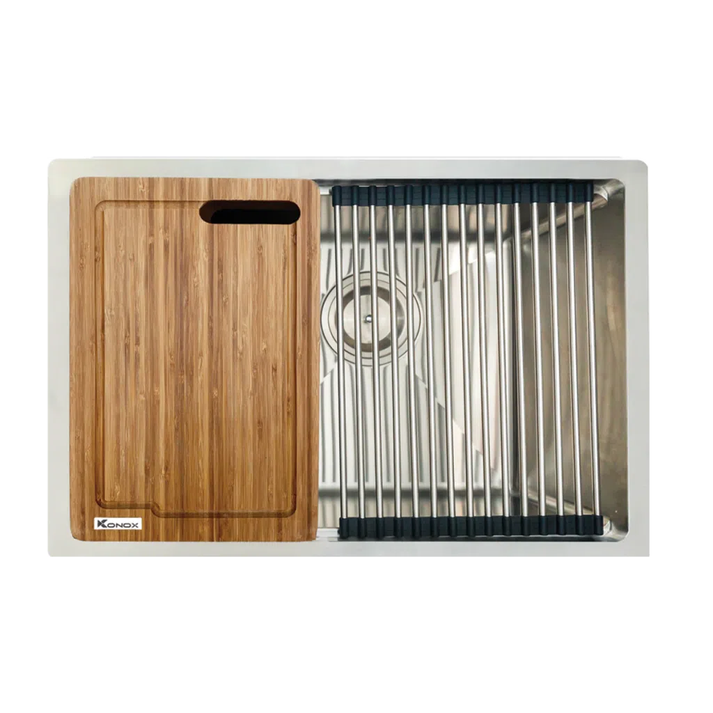 - Dòng chậu hạ bậc – tích hợp công năng: thớt gỗ, rollmat