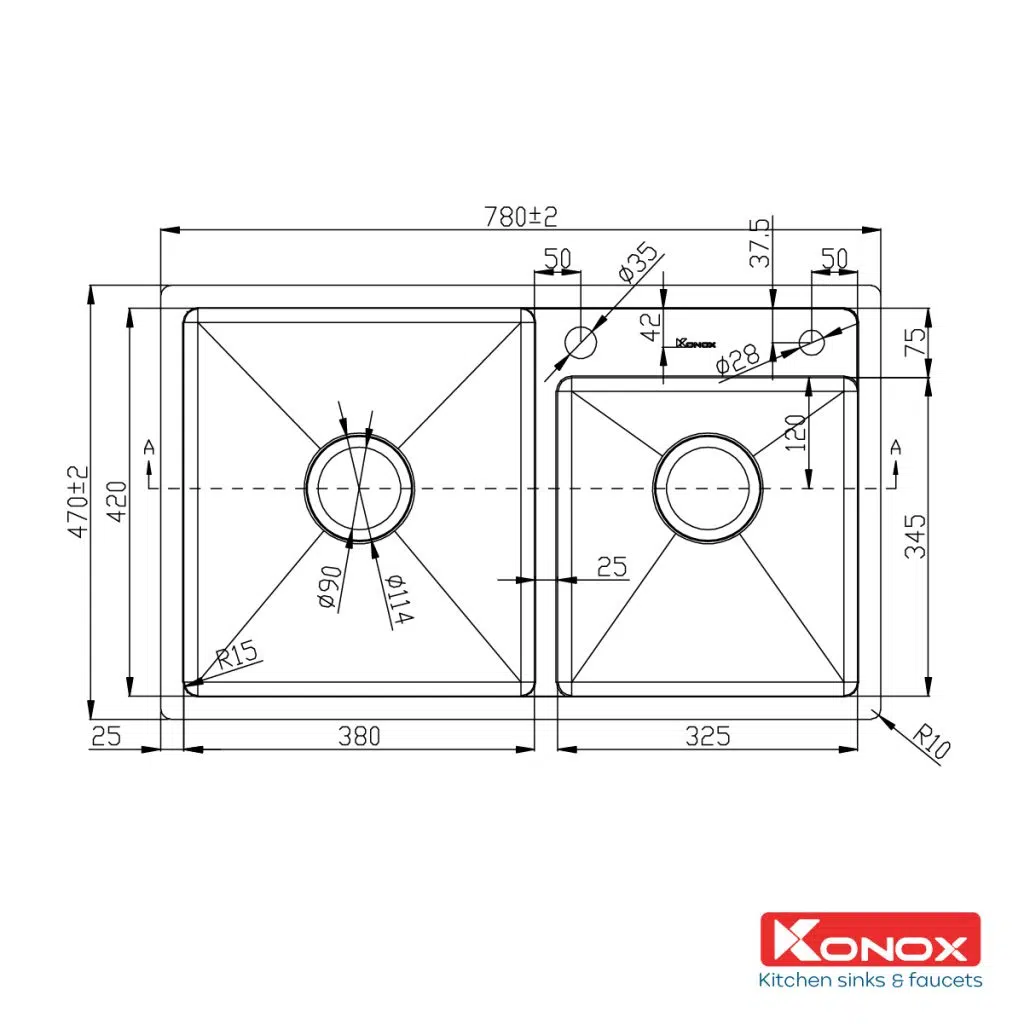 Với bề ngang chậu 780mm, chậu thích hợp với những bàn bếp hẹp ngang.