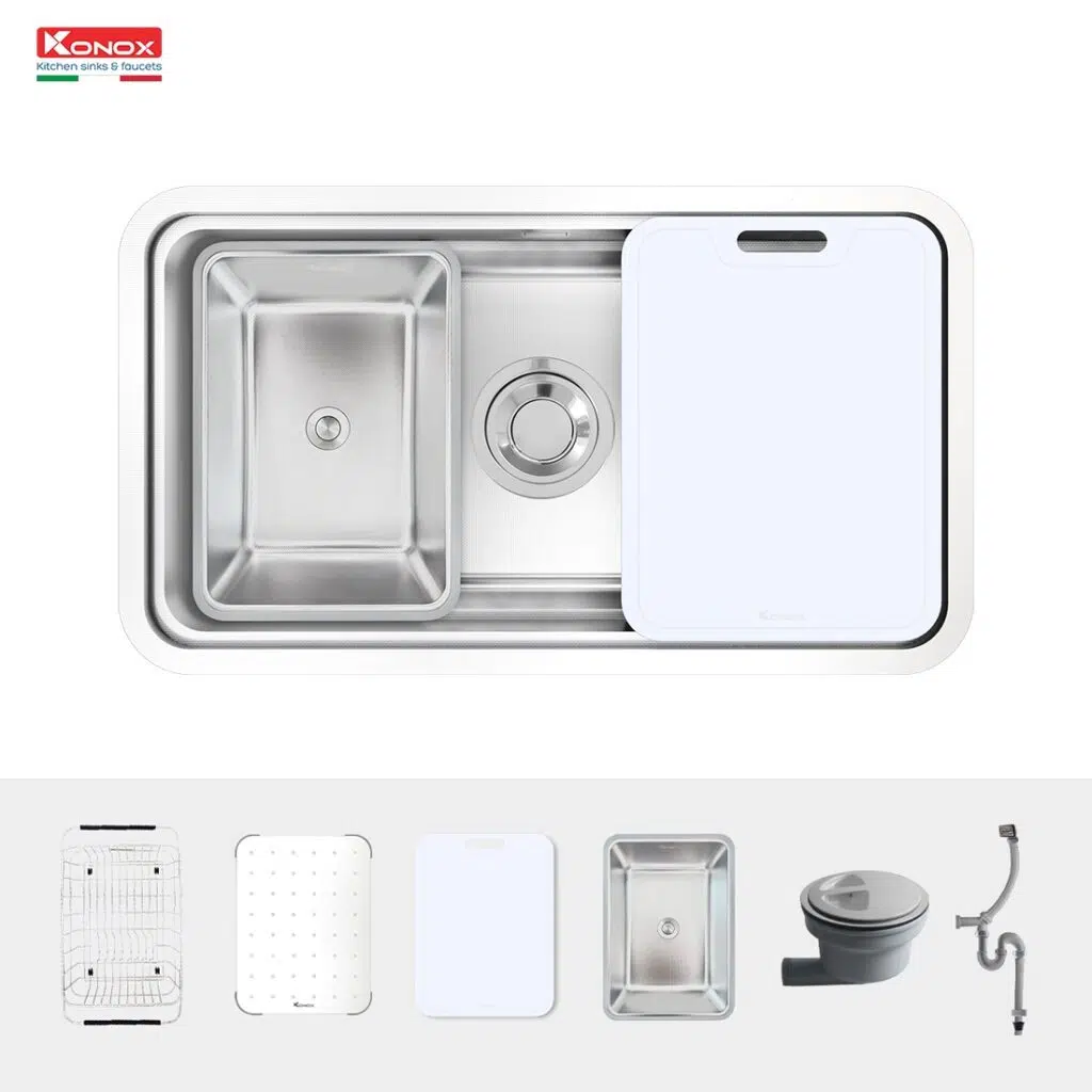 - Thiết kế hiện đại với gờ hạ bậc – tích hợp phụ kiện thông minh: Thớt nhựa, rổ úp bát, siphon