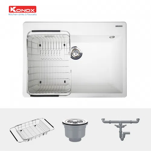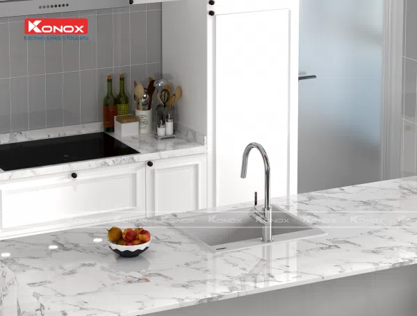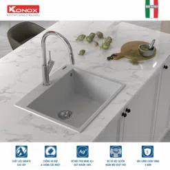 Chậu rửa bát đá Ruvita 680 White Silver nằm trong bộ sưu tập chậu vòi đá cao cấp của Konox – Kiệt tác Ý trong lòng bếp Việt
