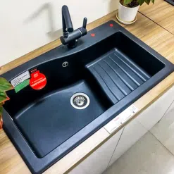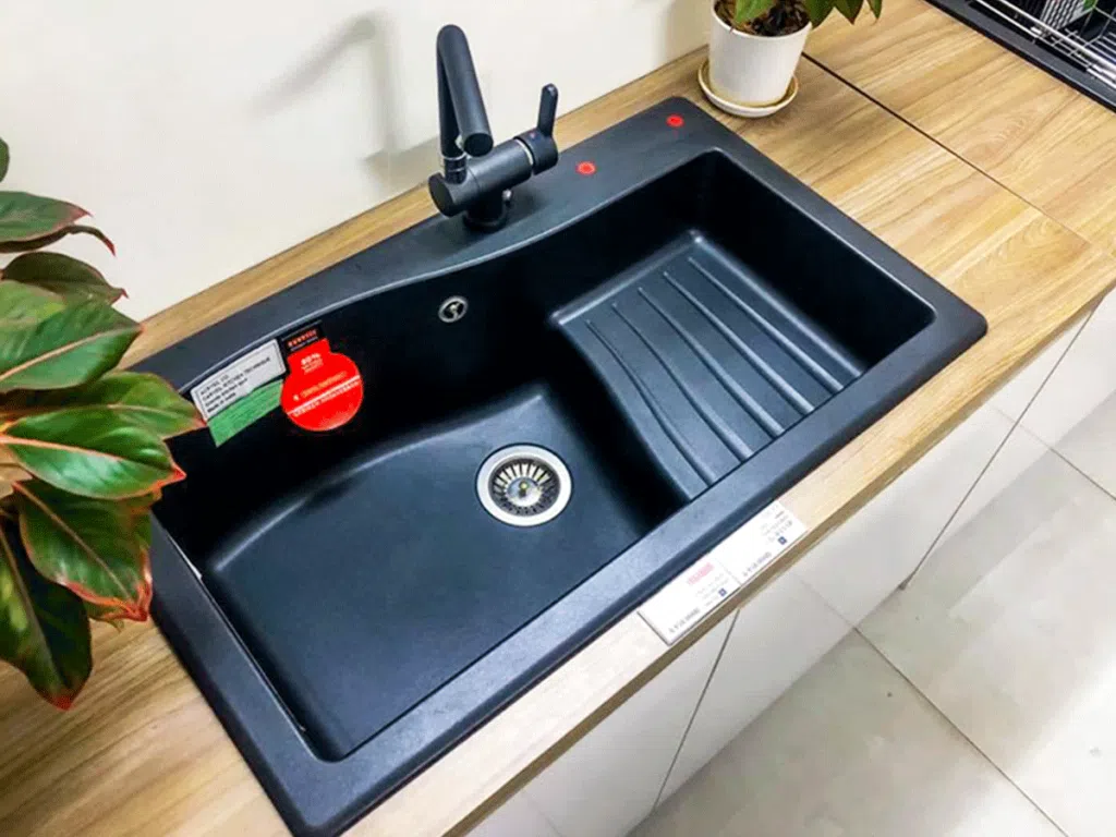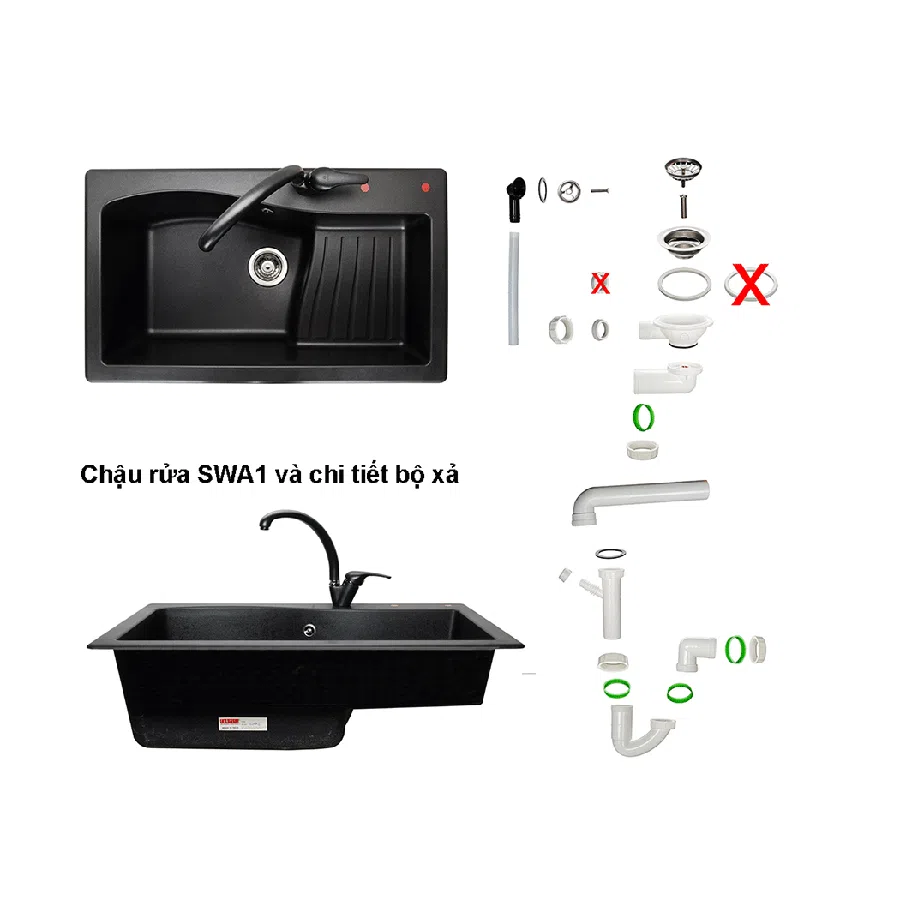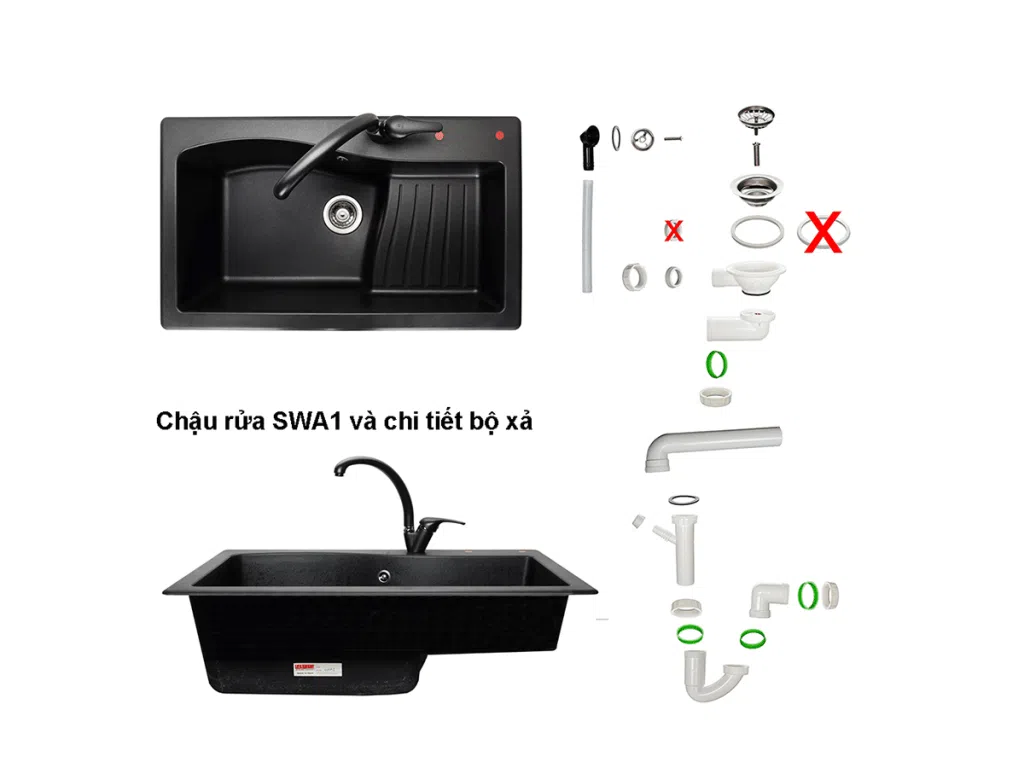 Chậu rửa chén bằng đá Granite SWA1 của Carysil đã bao gồm đầy đủ bộ xả (xiphong) phía dưới. Khách hàng sẽ không phải lo lắng mua thêm bộ xả khi mua mới chậu.