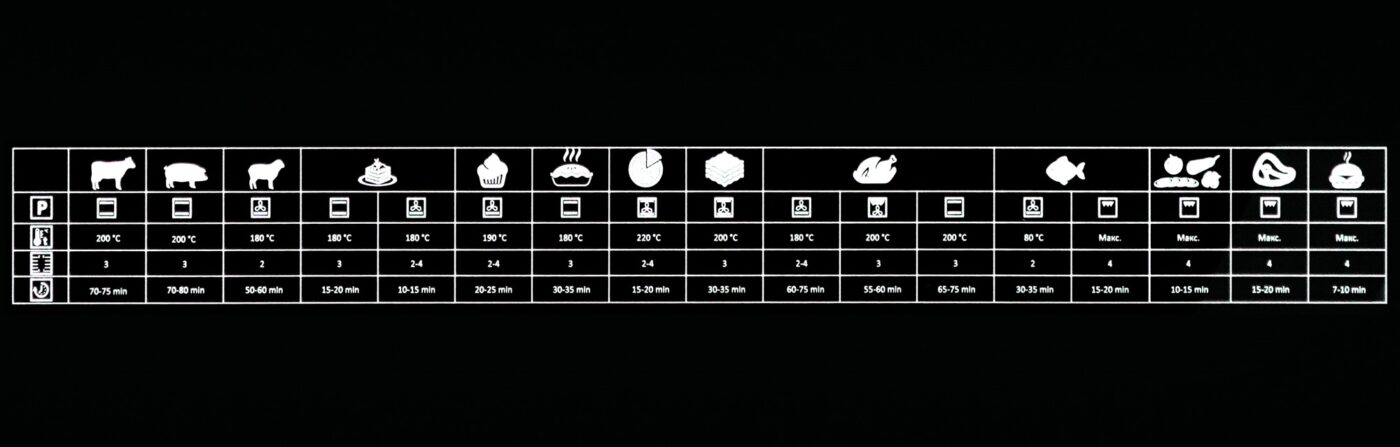 Mặt trong cửa có các mức nhiệt & thời gian nướng của một số món ăn phổ biến, khách hàng có thể tham khảo để nướng các món ăn dễ dàng hơn.