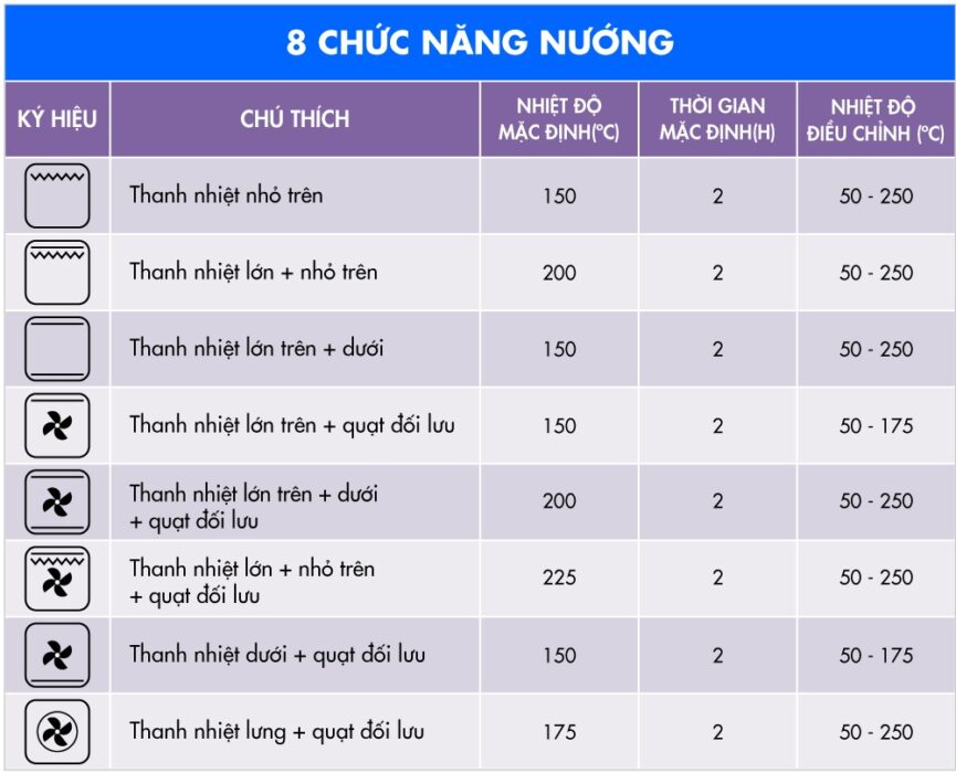 Lò nướng được tích hợp sẵn 8 chương trình nướng tự động để khách hàng có thể dễ dàng lựa chọn: Nướng nhanh, Nướng bánh, Gia nhiệt bên dưới, Nướng thịt, Nướng đối lưu, Quạt nhiệt, Quay, Quay nhanh