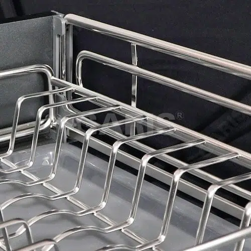Nan quả trám, inox 304, bề mặt khung màu titan lấp lánh theo góc nhìn và ánh sáng, bề mặt rổ bóng sáng với công nghệ điện hóa bóng gương Mirror BA, dùng cho cánh kéo