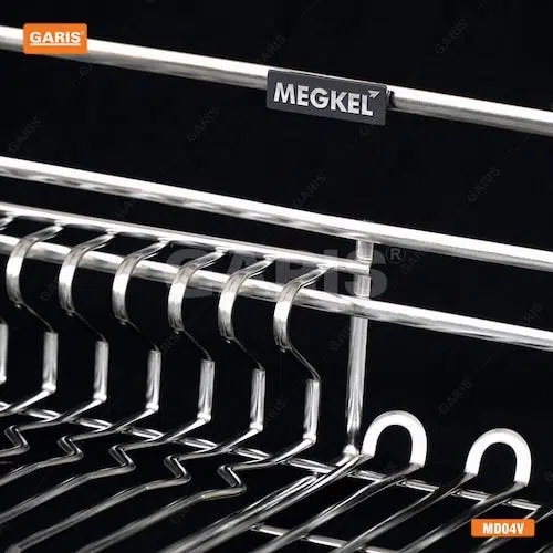 Giá bát đĩa xoong nồi Garis MD04.90V là nan quả trám, inox 304, bề mặt điện hóa bóng gương, dùng cho cánh mở/kéo.
