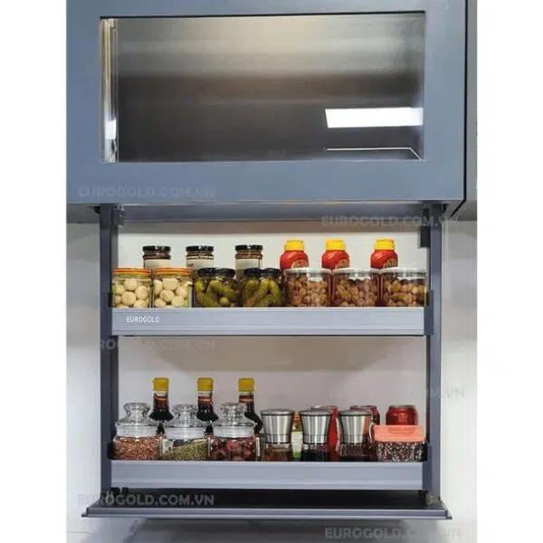 - Giá gia vị điện tự động Eurogold EMS3080 hoạt động dựa vào bộ cảm biến và hệ thống ròng rọc cùng ray trượt.