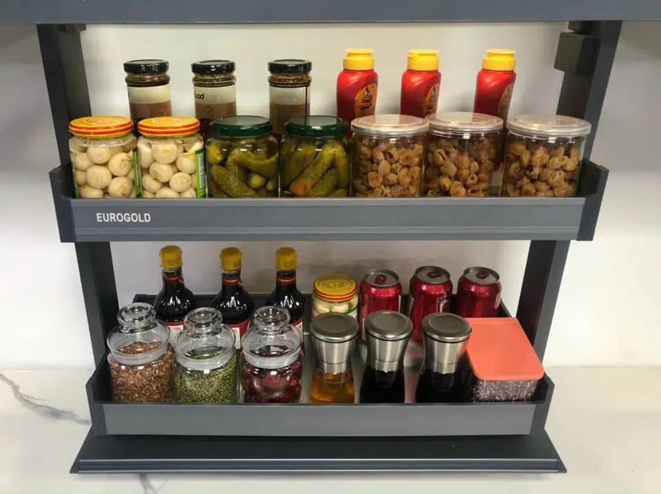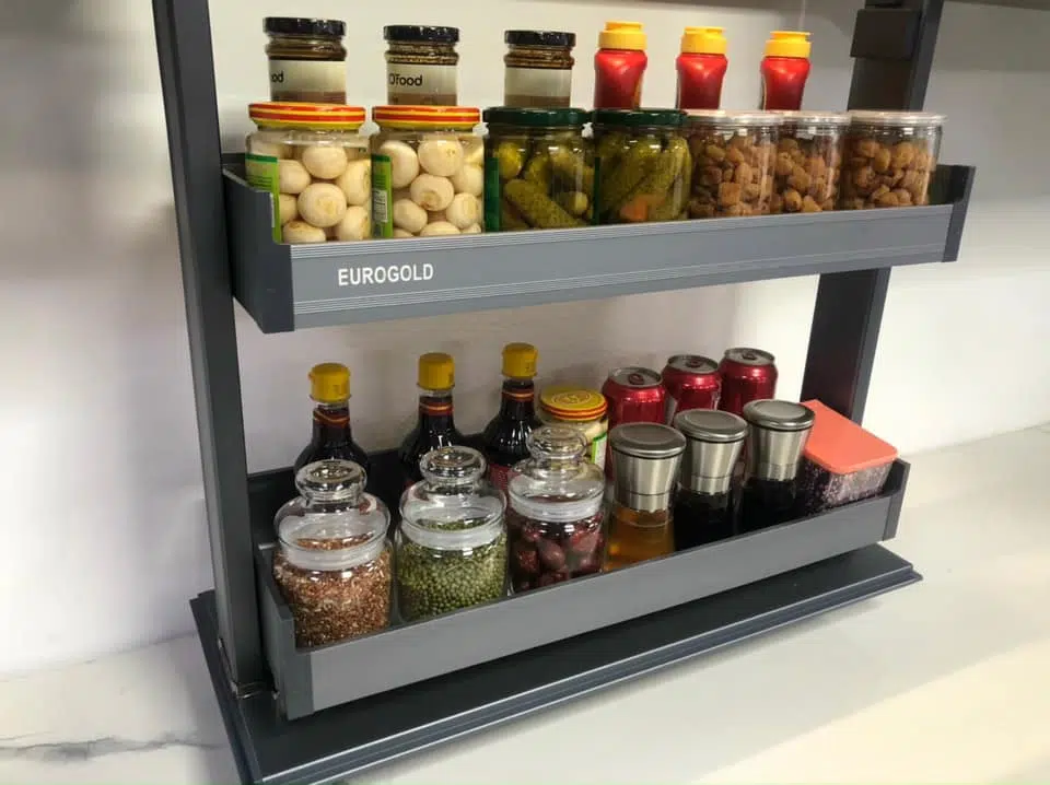 - Không những giúp người dùng lưu trữ các chai lọ gia vị gọn gàng sạch sẽ, giá gia vị thông minh còn là điểm nhấn giúp không gian bếp trở nên sang trọng ấn tượng hơn rất nhiều.