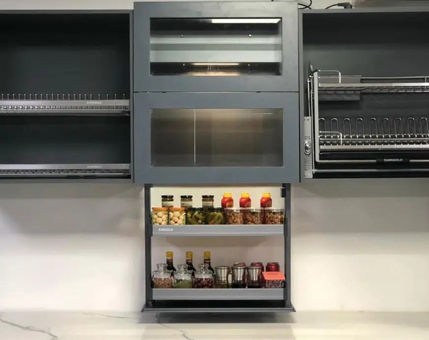 - Khu vực tủ bếp trên thường được dùng để lưu trữ bát đĩa thì nay với giá gia vị điện, gia chủ có thể tận dụng để sắp xếp bảo quản các chai lọ gia vị một cách gọn gàng, tối ưu nhất.