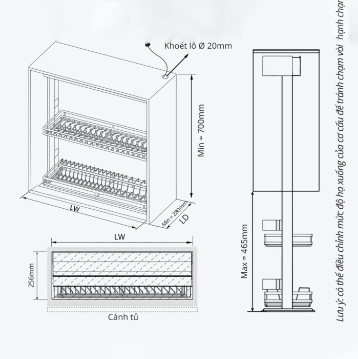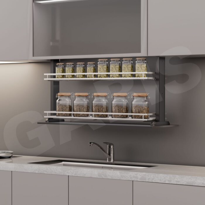 - Giá bát đĩa nâng hạ điện được làm từ khung nhôm chắc chắn, giúp tăng độ bền và độ ổn định của sản phẩm. Rổ gia vị được làm từ inox 304 điện hóa, có khả năng chống gỉ và bền bỉ theo thời gian.