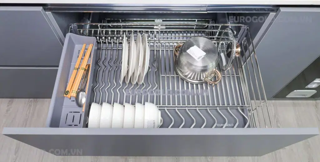 Thiết kế dạng nan Oval (hình quả trám), các nan được sắp xếp cách đều nhau đảm bảo ngăn tủ luôn khô thoáng, ráo nước. Xoong nồi rửa xong không cần đợi có thể úp vào luôn mà không lo nước đọng làm ẩm tủ.