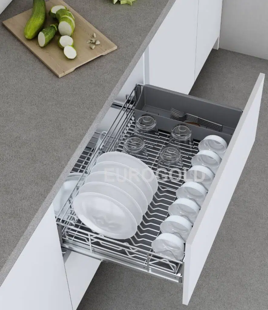 Thiết kế ray trượt sẽ giúp bạn tiết kiệm được rất nhiều sức lực khi lấy và cất đồ. Chỉ cần kéo hoặc chạm nhẹ, giá xoong nồi đa năng Eurogold inox Ova tự động đẩy ra và việc lấy đồ của bạn trở nên dễ dàng hơn.