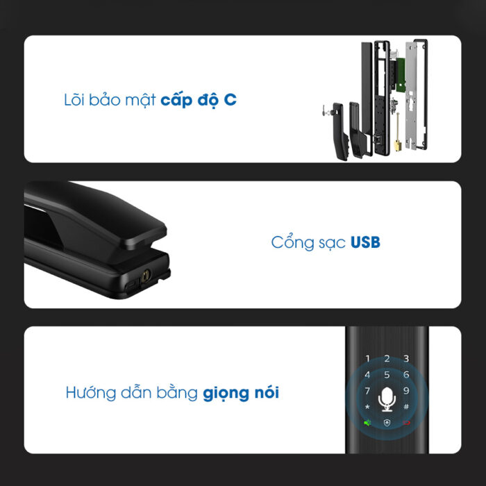Chức năng Mở khóa bằng vân tay, dấu bàn tay, thẻ từ, mật mã, chìa khóa khẩn cấp dự phòng chống sao chép