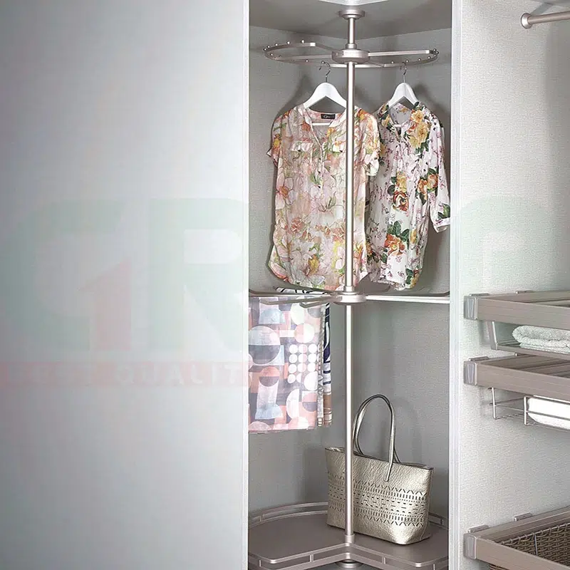 - Với hình dáng tròn 3/4 bạn có thể dễ dàng nhìn thấy và lấy vật dụng bên trong tủ. Một sản phẩm tiện lợi giải pháp cho tủ quần áo phát huy được cả góc tủ chết. Đây có thể là lựa chọn hoàn hảo cho những gia đình sử dụng tủ lớn có góc tủ.
