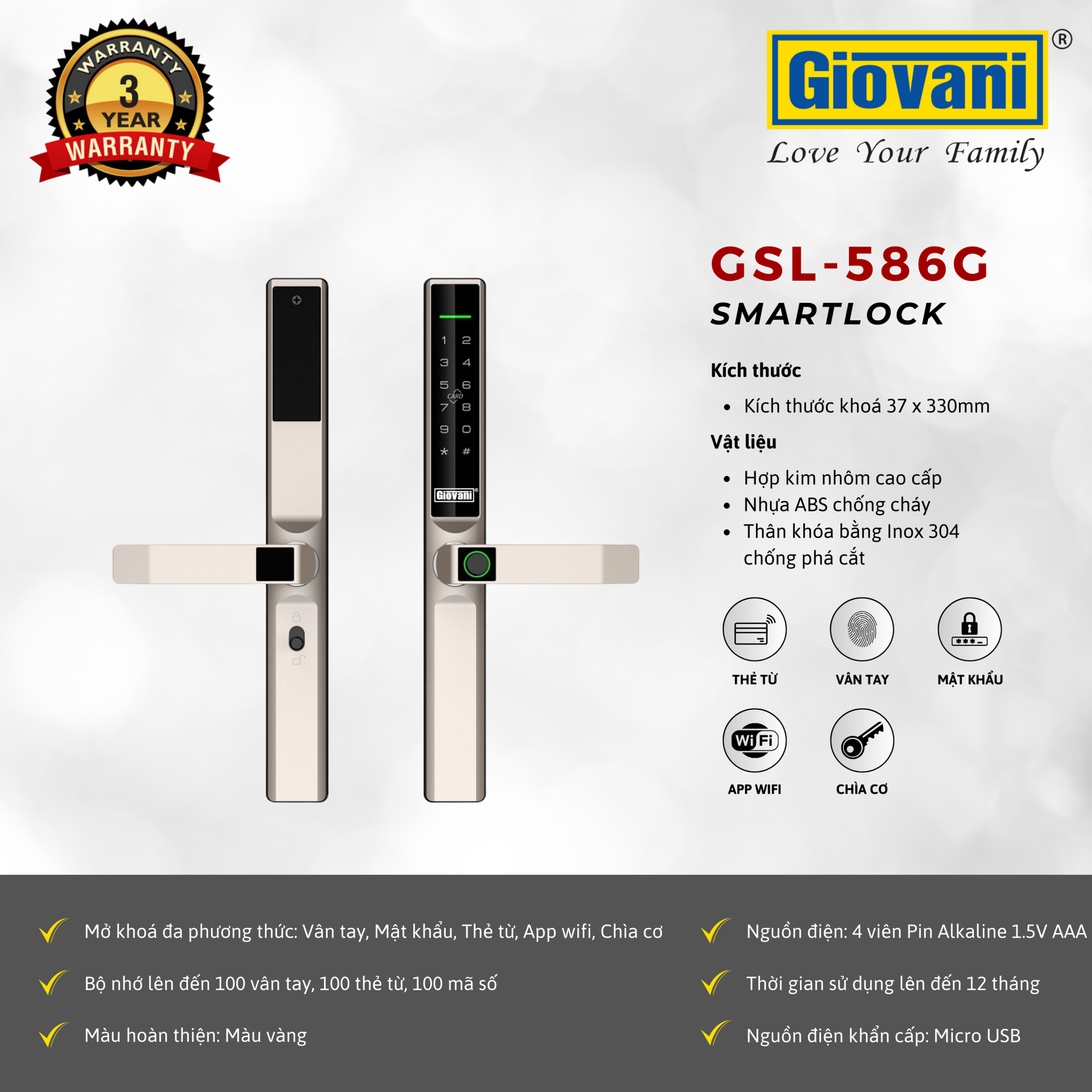Khóa cửa thông minh Giovani GSL-586G không chỉ bảo vệ ngôi nhà bạn mà còn nâng tầm chất lượng cuộc sống, mang đến sự an tâm và tiện nghi đích thực. Hãy để Giovani đồng hành cùng bạn xây dựng một tổ ấm an toàn, hiện đại và tràn đầy hạnh phúc.