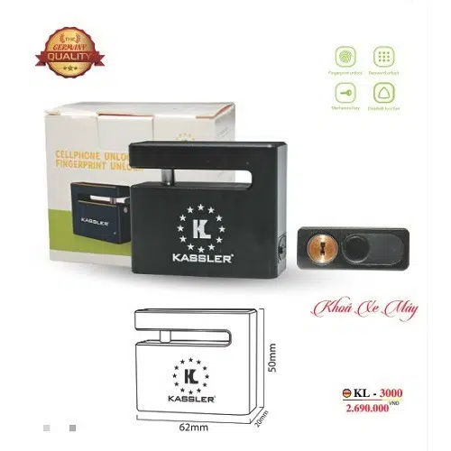 Khóa vân tay điều khiển từ xa kết nối Bluetooth Kassler KL-3000 đánh bay trộm tránh xa khỏi xe máy của bạn, an tâm hơn khi để xe ở bất cứ nơi đâu với khả năng chống trộm, có thông số kỹ thuật sau: