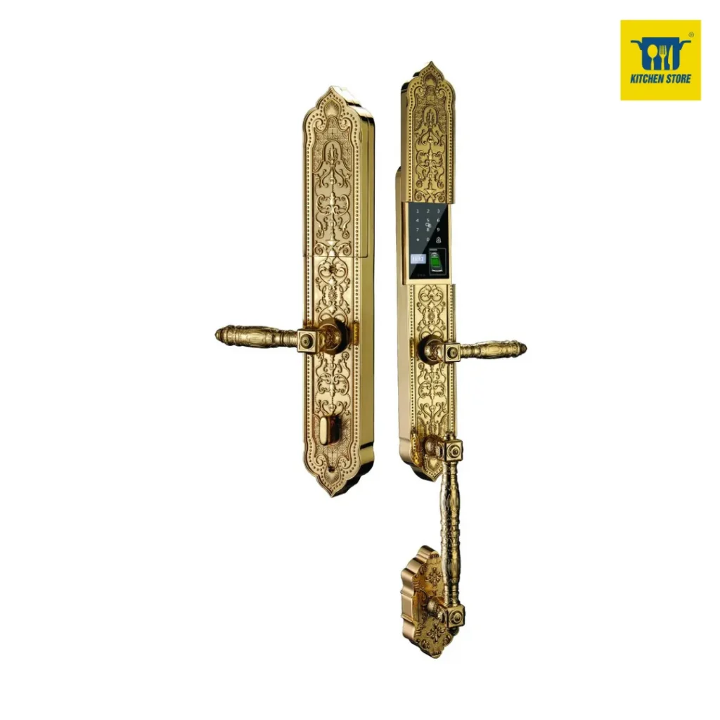 Khóa cửa đại sảnh Hubert HB DS I8 EU GOLD 24K nhập khẩu kết hợp phong cách thiết kế tân cổ điển và công nghệ hiện đại với tính năng mở cửa bằng vân tay, mật mã, thẻ từ, chìa cơ chống sao chép, đặc biệt APP WIFI mở cửa từ xa chất lượng cao chính hãng tại Kitchen Store.