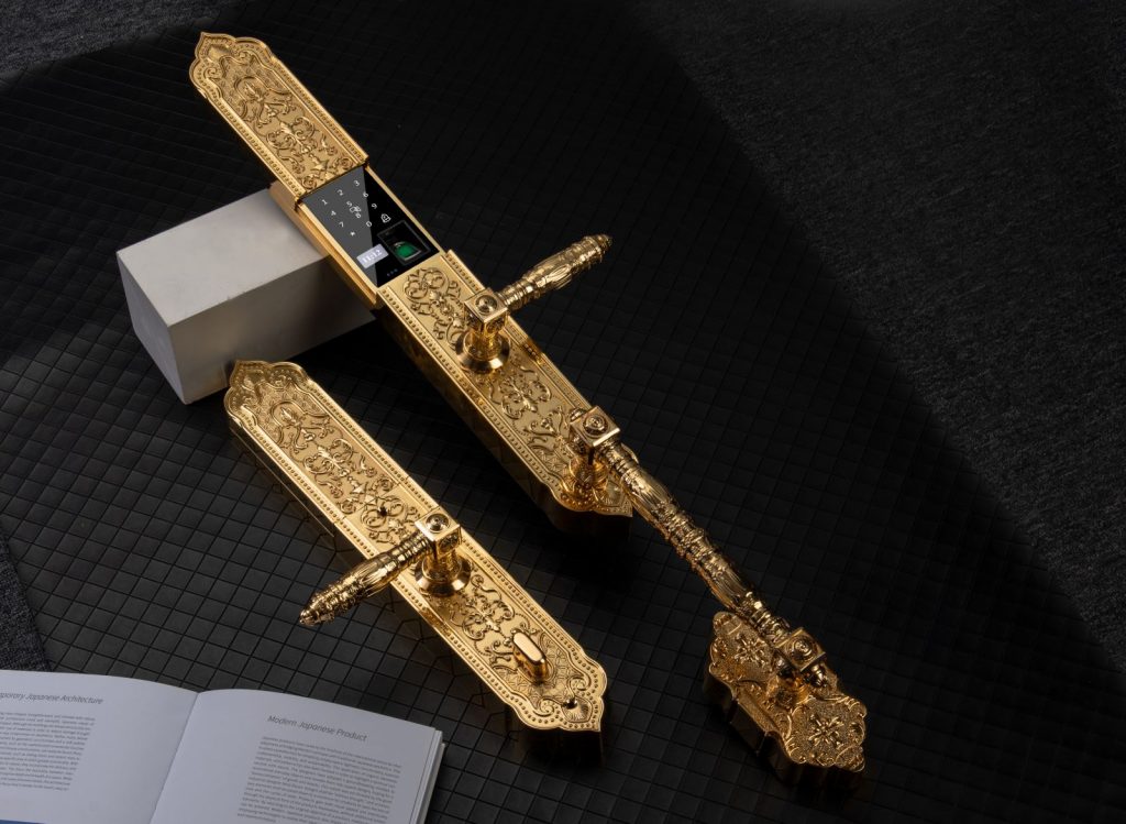 Khóa cửa đại sảnh Hubert HB DS79 mạ vàng 24K nhập khẩu kết hợp phong cách thiết kế tân cổ điển và công nghệ hiện đại với tính năng mở cửa bằng vân tay, mật mã, thẻ từ, chìa cơ chống sao chép, đặc biệt APP WIFI mở cửa từ xachất lượng cao chính hãng tại Kitchen Store.