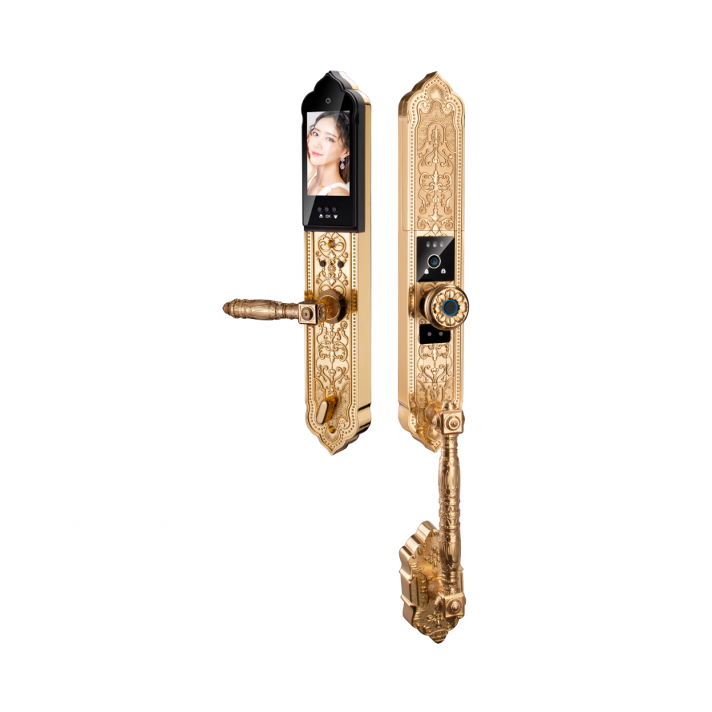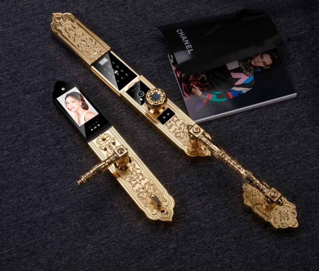 Khóa cửa đại sảnh Hubert HB DS86 mạ vàng 24K nhập khẩu kết hợp phong cách thiết kế tân cổ điển và công nghệ hiện đại với tính năng mở cửa bằng vân tay, mật mã, thẻ từ, chìa cơ chống sao chép, đặc biệt APP WIFI mở cửa từ xa,Face ID nhận diện khuôn mặt chống nước 99% chất lượng cao chính hãng tại Kitchen Store.