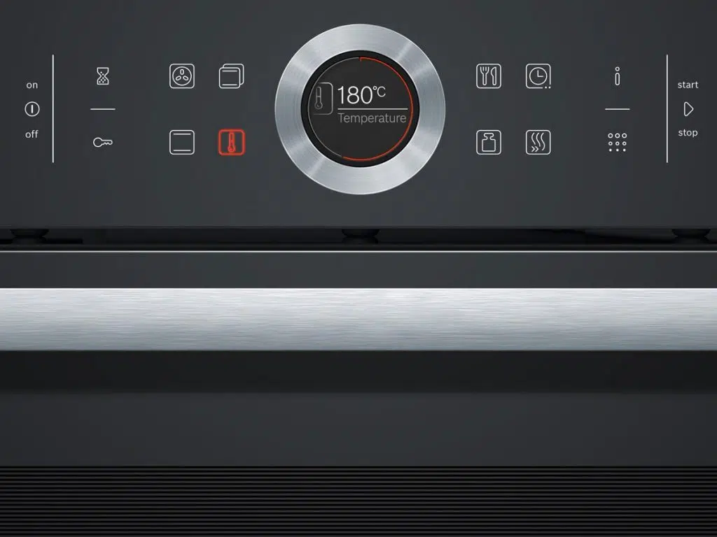 - Tay nắm cửa lò nướng Bosch tao nhã, núm điều khiển đa năng cùng màn hình LCD sắc nét giúp bạn dễ dàng quan sát bảng điều khiển từ mọi góc nhìn.