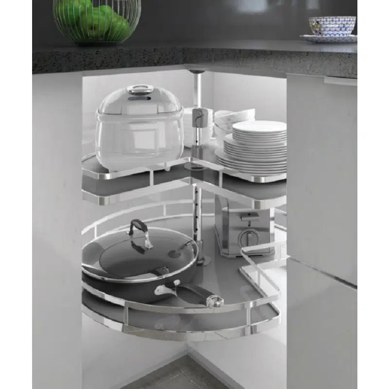 - Mâm xoay Grob GM304-270.8 bao gồm 2 sàn đựng bằng Inox SUS304 cao cấp với đáy Melamine màu trắng xám, thiết kế nửa hình tròn với một phần được gắn vào cánh tủ để khi bạn mở tủ thì 1 rổ đựng từ trong góc tủ sẽ chuyển động theo với góc 90 độ, đủ để bạn có thể nhìn thấy và lấy đồ dễ dàng.