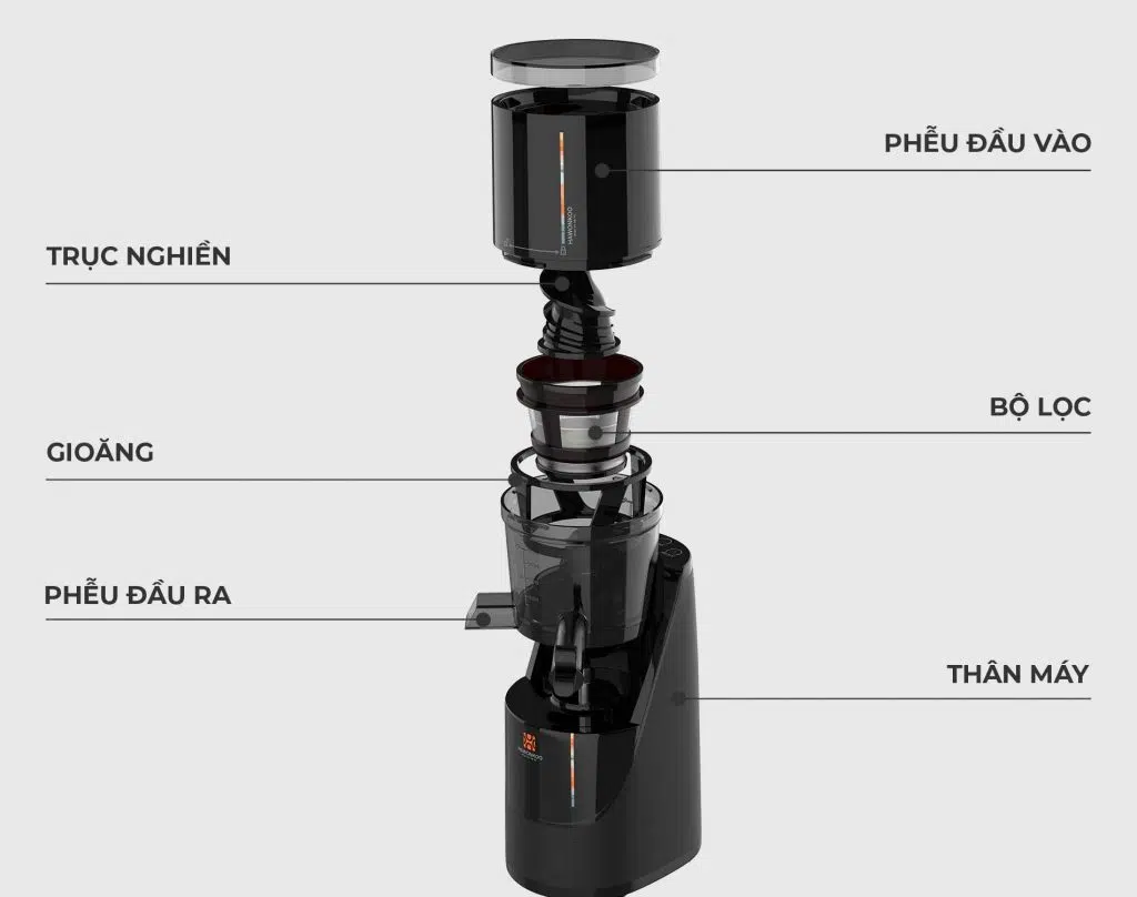 - 1 màng lọc mịn cho phép ép mịn bằng các lỗ lọc siêu nhỏ nhằm loại bỏ cặn bã vụn để cho ra dòng nước ép tinh khiết