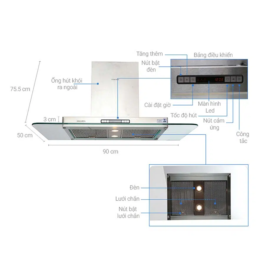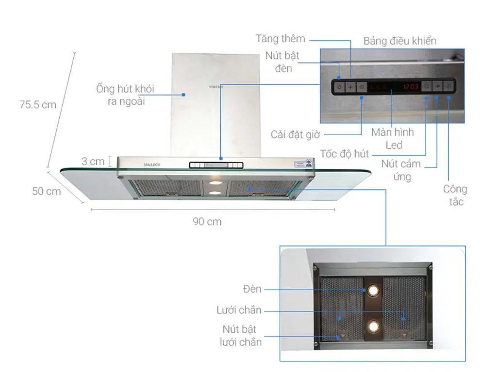 Máy hút mùi Malloca MC 9099 LCD có khả năng hút, khử mùi làm sạch – làm thông thoáng cho không gian bếp của gia đình và bảo vệ sức khỏe của gia đình bạn.