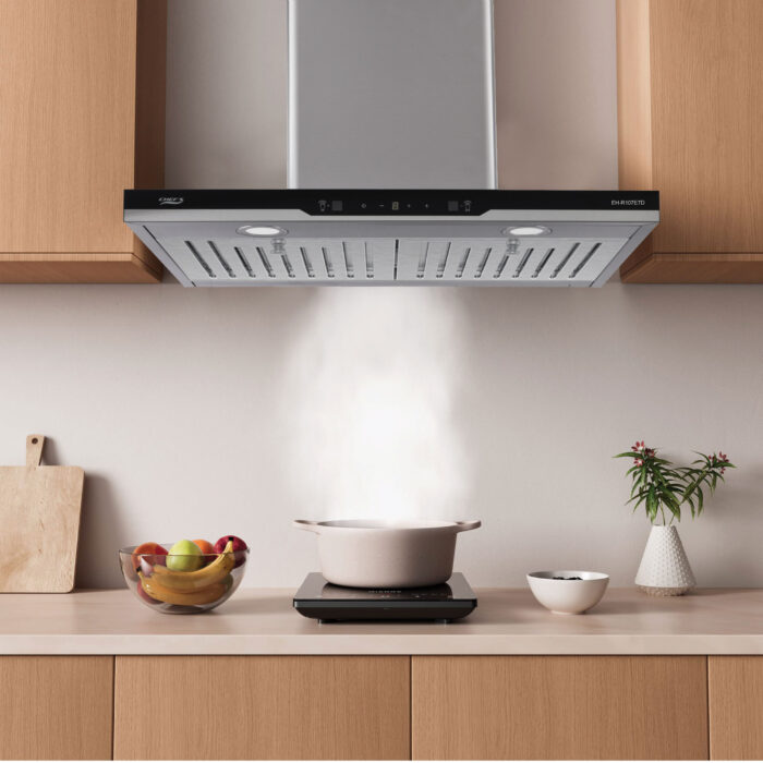 Máy hút mùi EH-R107E7D có thiết kế dạng chữ T nhỏ gọn, bề mặt phủ kính cường lực hiện đại, sang trọng dễ dàng vệ sinh