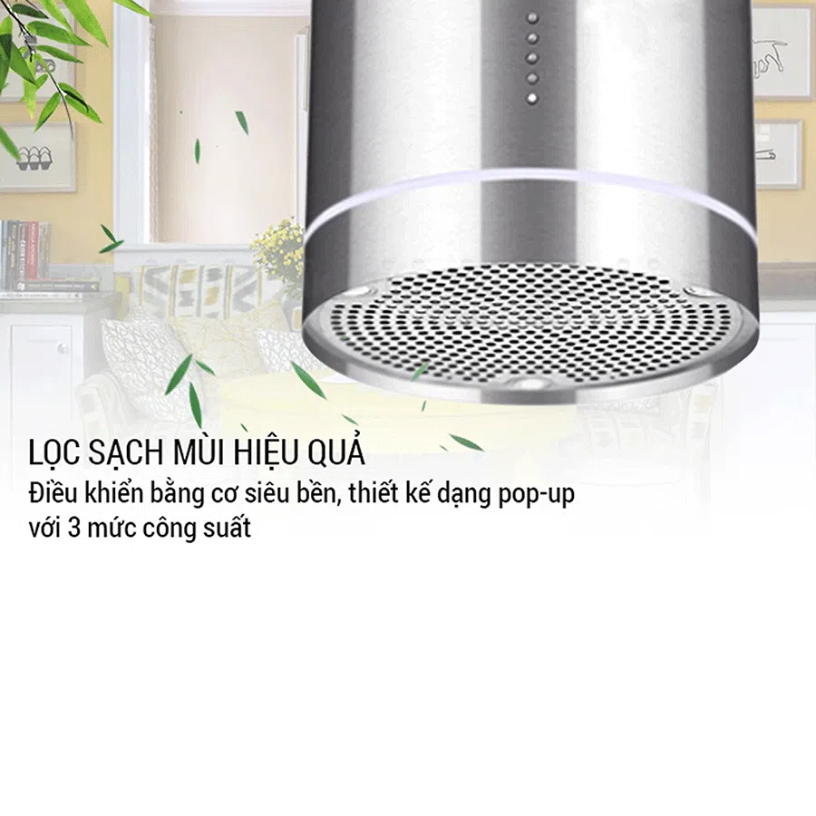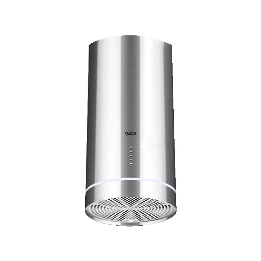 Máy hút mùi hình trụ sang trọng độc đáo, phù hợp với các gian bếp thiết kế chữ L, bàn đảo độc lạ. Màu sắc inox sáng, sang trọng và nổi bật.
