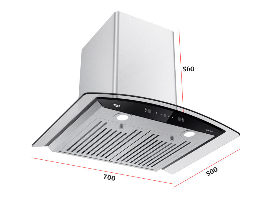Máy hút mùi CHEF’S EH-R502E7D hình dáng kính cong mềm mại phù hợp với nhiều không gian bếp hiện đại. Chất liệu thân máy làm từ inox cao cấp 430 sang trọng, màu sắc sáng, dễ dàng lau rửa, vệ sinh.