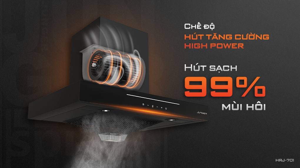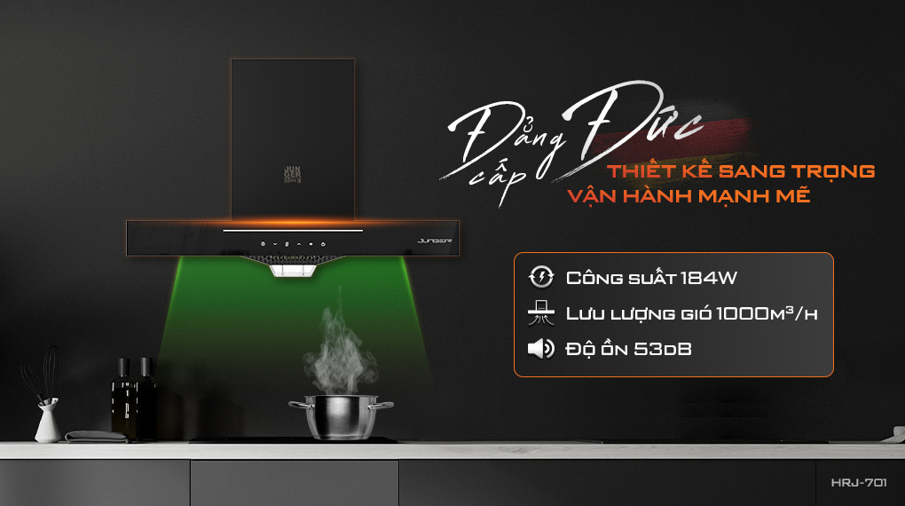 Junger HRJ-701 được trang bị động cơ AC thế hệ mới chống hơi nước siêu yên tĩnh kết hợp quạt gió động cơ dạng tuabin phát ra âm thanh nhỏ 53dB ngay cả khi hoạt động ở mức công suất mạnh nhất. Lực hút 1000m3/h nhanh chóng làm sạch bầu không khí trong khu vực nấu nướng, loại bỏ đến 99% mùi dầu mỡ và mùi thức ăn khó chịu.