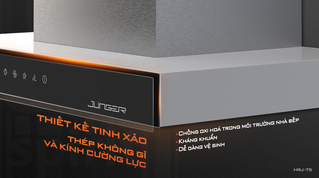 Khung máy hút mùi Junger HRJ-75 được chế tạo từ thép không gỉ cao cấp phủ sơn tĩnh điện, mang đến độ bền bỉ vượt trội, khả năng chống oxy hóa hiệu quả trong môi trường nấu ăn nhà bếp. Chất liệu này không chỉ dễ dàng vệ sinh mà còn có khả năng kháng khuẩn tốt, đảm bảo an toàn cho sức khỏe gia đình.