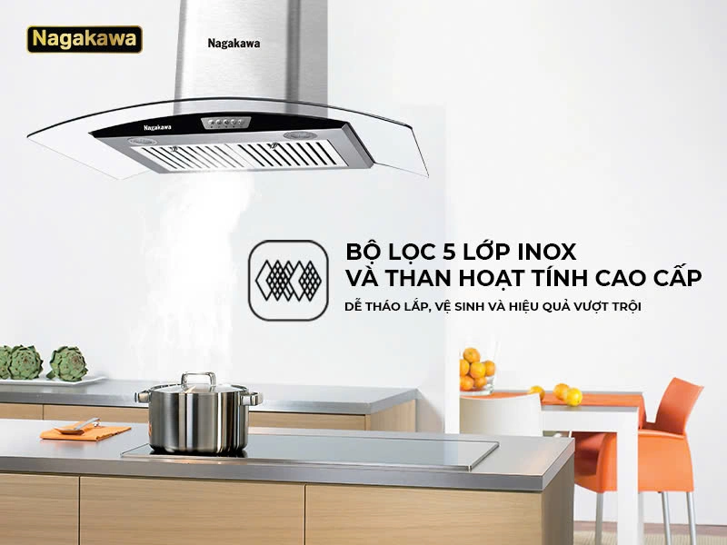 Hệ thống lọc than hoạt tính cao cấp Nagakawa tạo cơ chế trao đổi khí mạnh mẽ, hấp thu cặn bẩn, khói bếp,… đồng thời khử mùi hoàn toàn theo tiêu chuẩn của máy lọc không khí, giúp không gian bếp luôn thoáng mát, trong lành. Bên cạnh đó, khay hứng mỡ thông minh, loại bỏ dầu mỡ thừa dễ dàng, để mỗi phút giây của gia đình bạn trong bếp đều thư thái, dễ chịu.