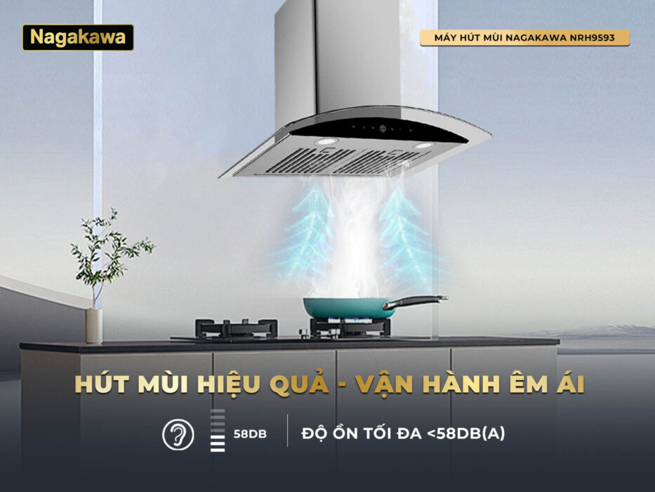 Độ ồn tối đa của Máy hút mùi Nagakawa NRH9593 chỉ < 58 dB(A), hoạt động êm ái, không gây tiếng ồn khó chịu, mang đến không gian bếp yên tĩnh và thoải mái.
